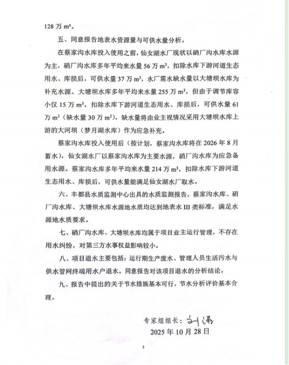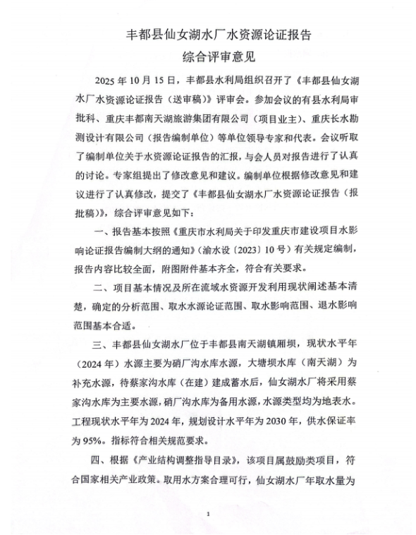 附件:豐都縣仙女湖水廠水資源論證報告綜合評審意見
