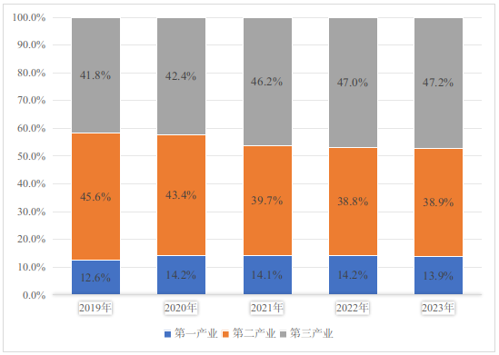 圖2 ?2019-2023年三次產(chǎn)業(yè)增加值占全縣地區(qū)生產(chǎn)總值比重