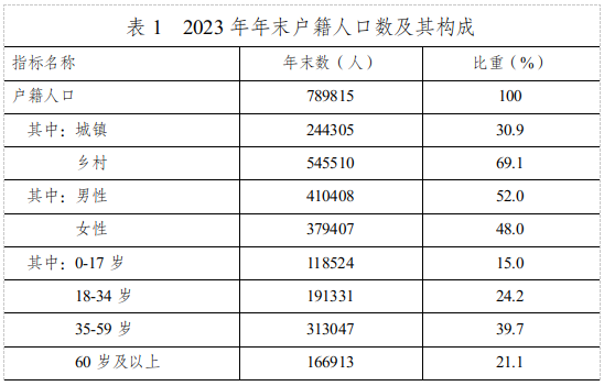 年末全縣戶籍人口789815人。按城鄉(xiāng)分,城鎮(zhèn)人口244305人,鄉(xiāng)村人口545510人。按性別分,男性人口410408人,女性人口379407人,人口性別比(以女性為100,男性對女性的比例,下同)為108.0。全年出生人口3988人,人口出生率5.03‰,死亡人口7386人,人口死亡率9.31‰,人口自然增長率-4.28‰,出生嬰兒性別比109.8。全年遷入人口4604人,遷出人口7780人。
