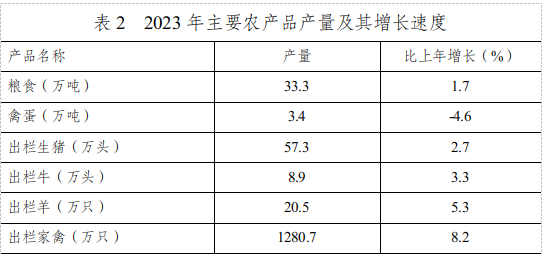 ? ? 全年糧食播種面積100.6萬畝,比上年下降2.0%。糧食總產(chǎn)量33.3萬噸,比上年增長1.7%。生豬出欄57.3萬頭,比上年增長2.7%;牛出欄8.9萬頭,比上年增長3.3%;羊出欄20.5萬頭,比上年增長5.3%;家禽出欄1280.7萬只,比上年增長8.2%;禽蛋產(chǎn)量3.4萬噸,比上年下降4.6%。