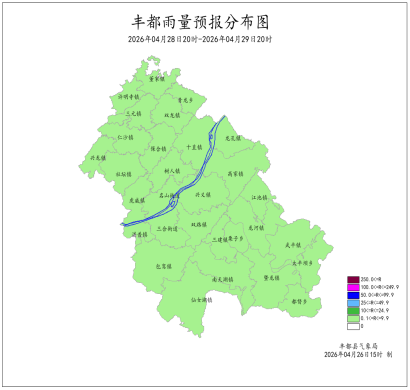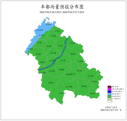 2026年4月25日16時至4月26日16時我縣多云轉陣雨。最大降雨量為2.1mm(都督沙坪村);最低氣溫6.2 (太平壩)~19.4℃,最高氣溫18.9~35.1℃(高家鎮)。武平出現7級大風,極大風速15.9米/秒(武平峰子山,26日07時)。豐都國家基本站最低氣溫17.5℃,最高氣溫30.0℃。